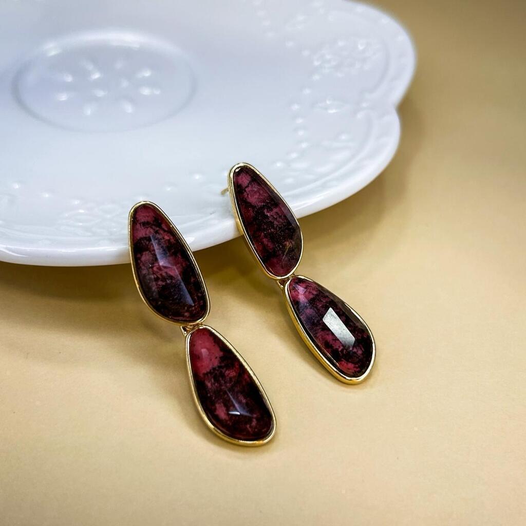 O Brinco Gotas Rodonita inspira-se na fluidez da água e no frescor da primavera. A pedra de rodonita, em formato delicado, ganha realce com o banho em ouro 18k.