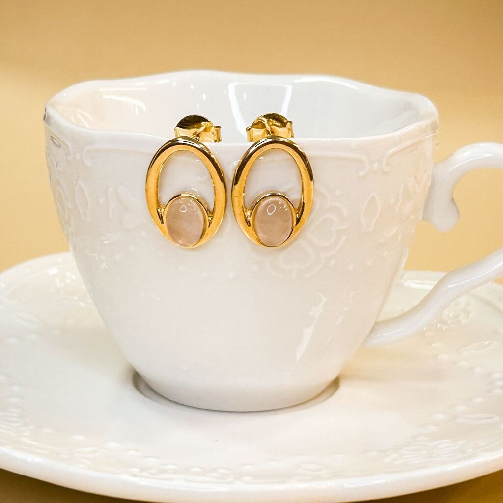 O Brinco Magnólia Quartzo Rosa traduz a suavidade e o romantismo da primavera. A pedra de quartzo rosa, emoldurada pelo banho em ouro 18k, cria uma joia delicada e atemporal.