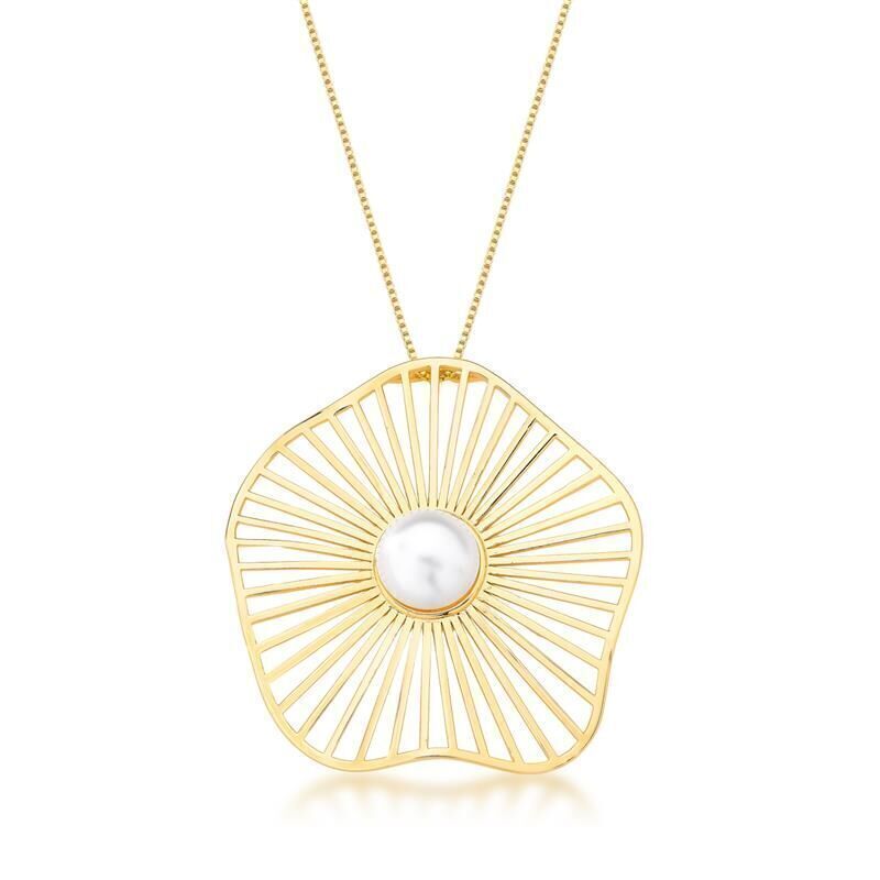 Com um pingente em forma de flor vazada, esculpida em pérola shell, este colar de 70cm encanta por sua leveza e presença. O banho dourado realça o design curvo e orgânico, criando um visual romântico e contemporâneo. Uma joia que floresce no colo, perfeita para composições femininas e cheias de personalidade.
