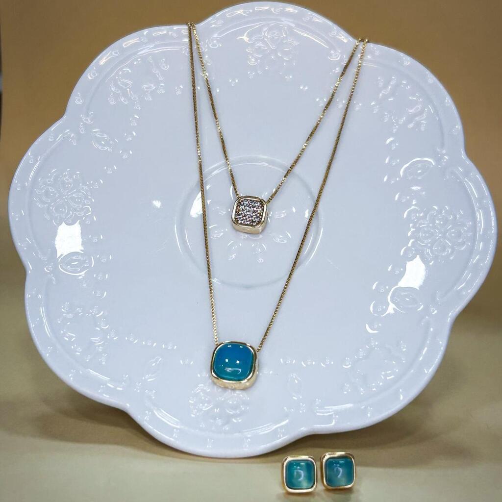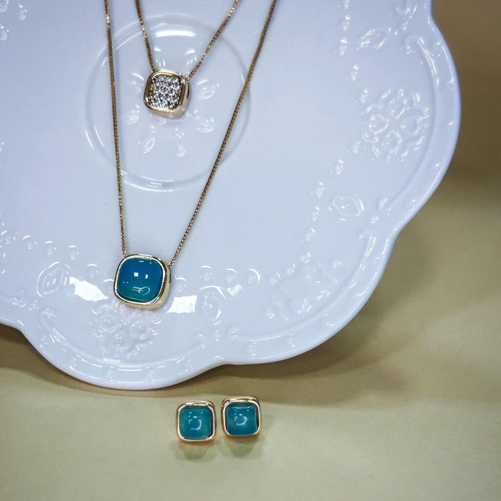 O Conjunto Primavera Ágata Azul Céu traduz a serenidade do céu em dias claros. Com pedras naturais e banho em ouro 18k, celebra a beleza leve da primavera.